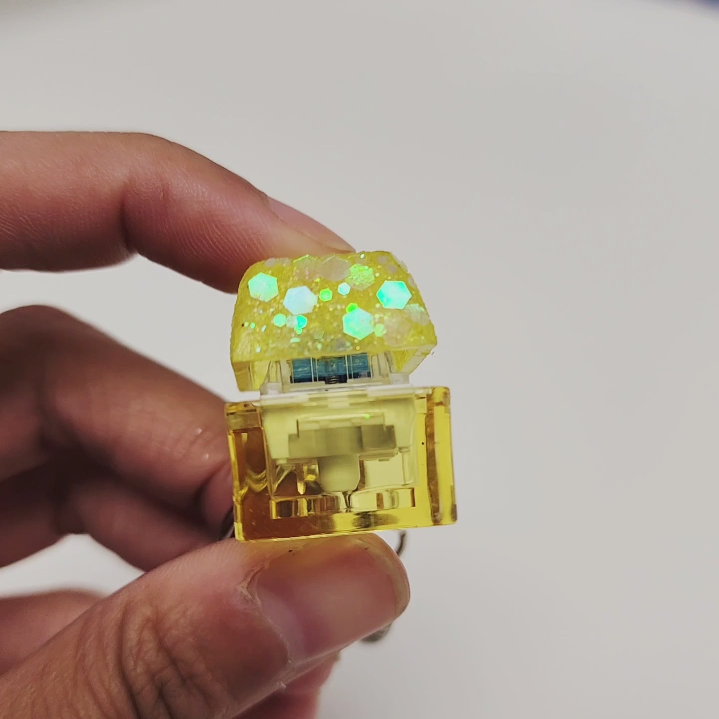 FEATURES: Hand-glittered yellow glitter keycap with clear yellow housing and blue switches